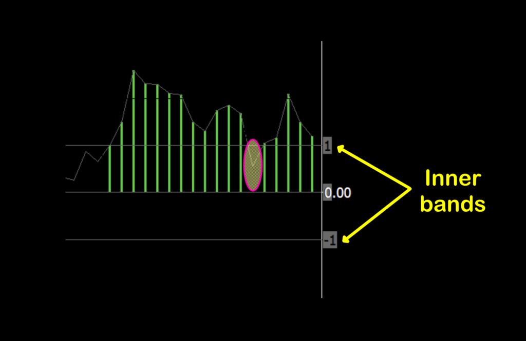 The first thing we’ll address are the “Inner bands”. They serve as a filter whereby if the histogram bar data does not meet a specific minimum value, no candle is printed (circled in magenta), meaning that a proper trend has not developed. The Inner bands value is adjustable in the settings menu. We will be using these.