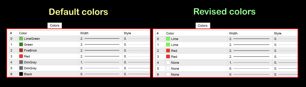 Before we get into the input settings, let’s get our charts squared away with regard to what we see. The first thing is to change the colors. We’ve created a side-by-side image of what the default colors are and one with the new and improved colors.