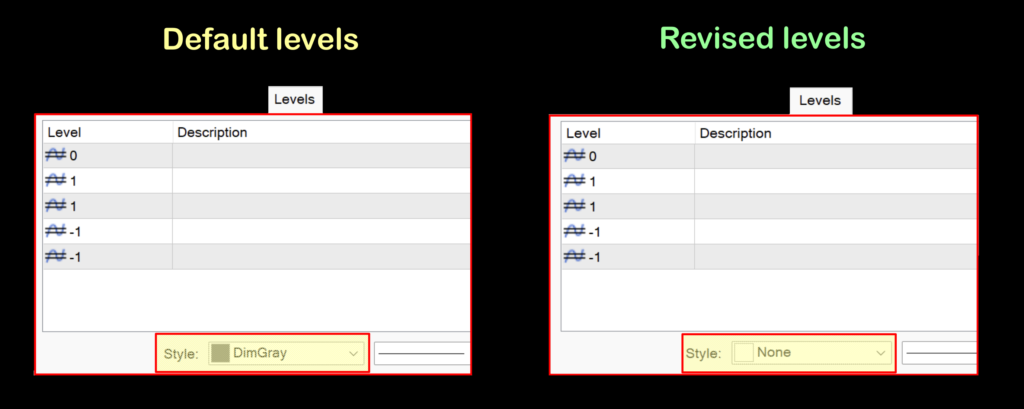 If you make changes to the band levels in the input menu, it will automatically change in the level menu, so you won’t have to deal with them as noted below. The only thing you’ll need to do is change the color of the bands from “DimGray” to “None”.