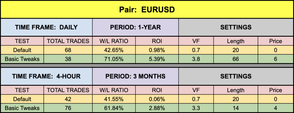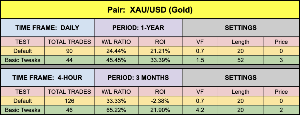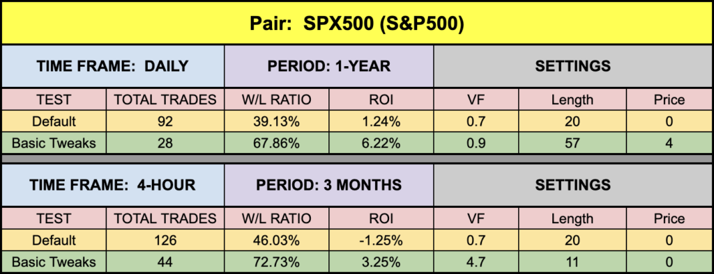 A little soft on the EUR and SPX500, although the SPX500 posted better numbers than we’ve seen with other indicators in the recent past. There were better settings, but the number of trades begins to rise exponentially and becomes somewhat cumbersome. The XAU did very well, and BTC also performing well, even on the 4-hour chart.