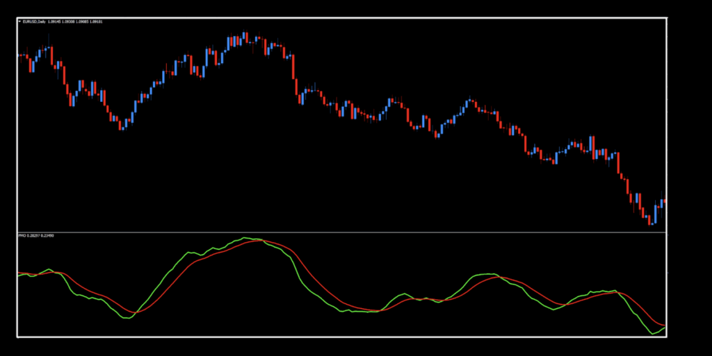 PMO Line = 20-period Custom Smoothing of (10 * 35-period Custom Smoothing of (((Today’s Price/Yesterday’s Price) * 100) – 100))