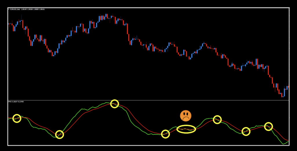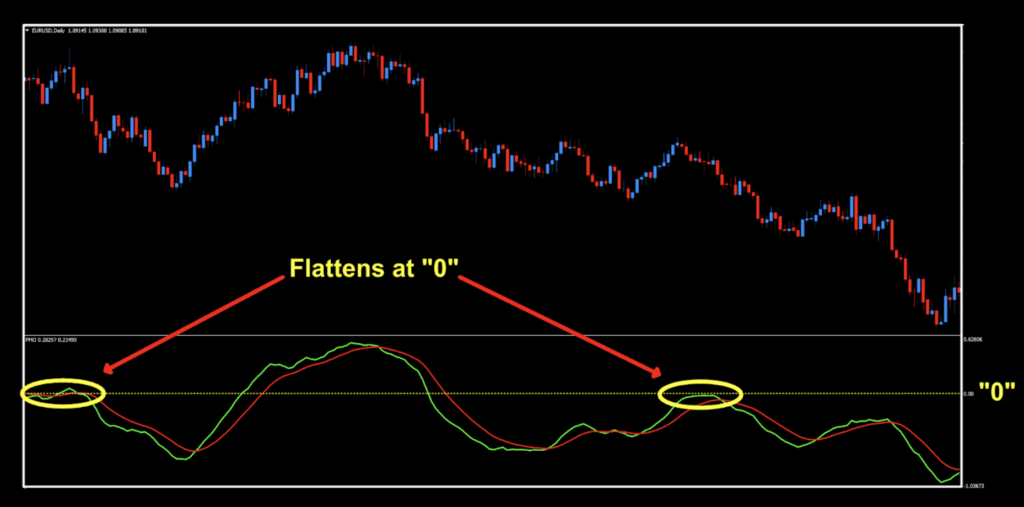 This indicator is called the Price Momentum Oscillator and was developed by Carl Swenlin and came to our world via MT4 in 2015. It oscillates across a zero line, but isn’t a zero line cross, but rather a two lines cross signal generator. This is evident because of the inherent “noise” at the zero level where the indicator flattens out, and multiple signals may exist. We’ve got a screenshot of that effect a little further down. It looks similar to the MACD, but is actually different because of the absolute value of each indicator. The MACD is based on moving average calculations, whereas the PMO is an internal ratio. ‘Nuff said.