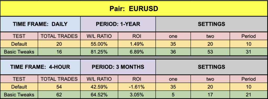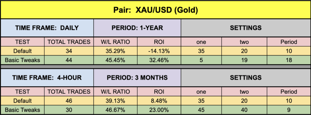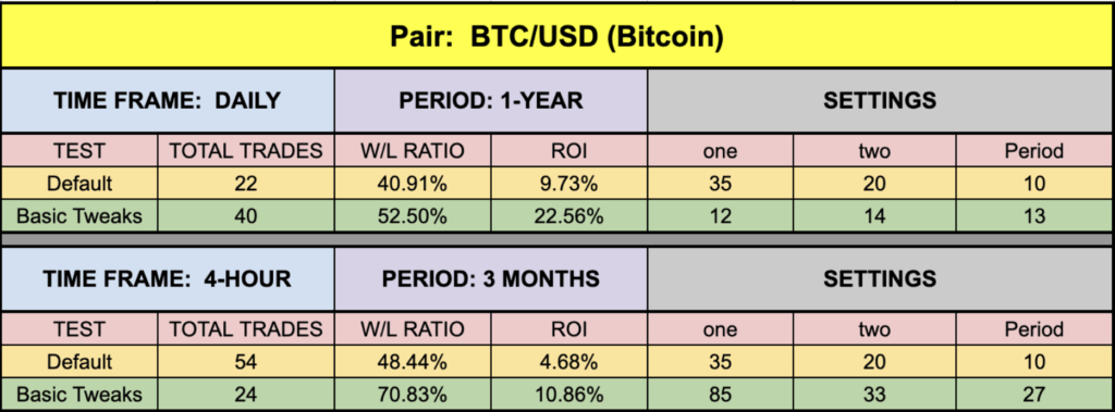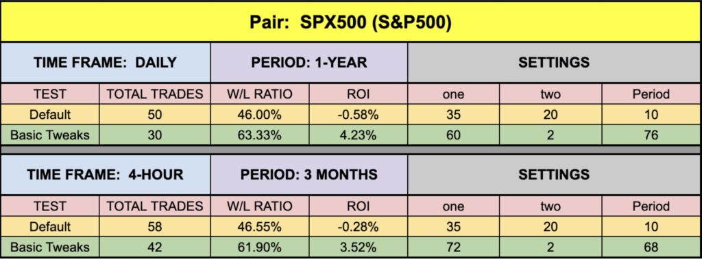 One of the first things we noticed was that in all but one instance, the default settings returned very close to zero, or positive — a sign that the indicator is a well oiled machine. The SPX500 number was a little soft, but the EUR was a bit better on this. BTC and XAU followed through with some very handsome numbers, and they weren’t even the best ones.