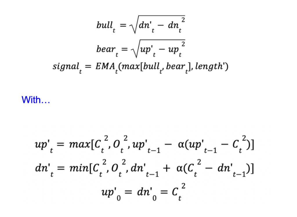 Where EMA denotes an exponential moving average (natch). The calculations for “up_t” and “dn_t” are given in the exponential envelopes section.