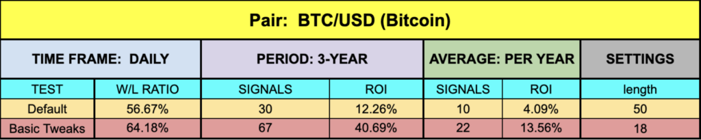 Not too bad across the board.  EUR and SPX were neck and neck once we applied the tweaked settings, but the default numbers on the EUR were actually okay.  Of course, BTC and XAU did nicely, with the number of signals keeping pace with the decent ROI percentages.
