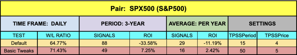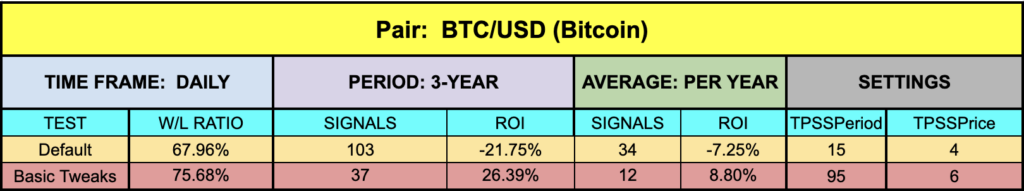 Numbers were all over the place on this. Check out the ROI spread between the default and tweaked values on BTC. The one thing you’ll notice is that overall, they seem a bit “soft” as compared with some of the metrics we’ve seen in recent past. Remember that baseline indicators are a kind of strainer to determine if a trend is in place, but you need all of your tools to determine the best entries.