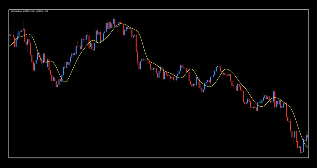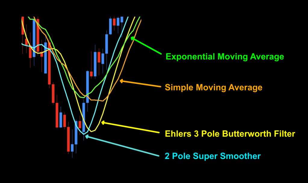 This indicator, as mentioned, comes from John Ehlers and was adapted for financial market data analysis, was introduced in his book Cybernetic Analysis for Stocks and Futures, published in 2004. The indicator is designed to provide a very smooth signal line with less lag than traditional moving averages, which we can see below.