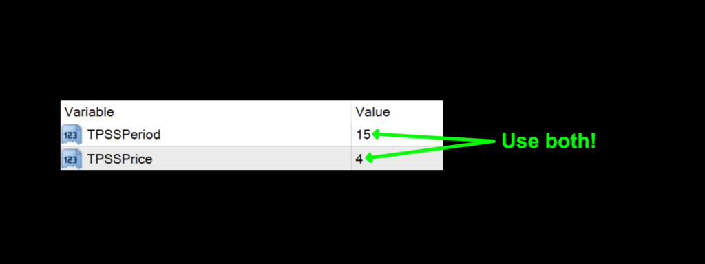 TPSSPrice: The data set used in the TPSSPeriod calculations where 0-close, 1-open, 2-high, 3-low, 4-median, 5-typical, 6-weighted. The default value is “4”, or median.
