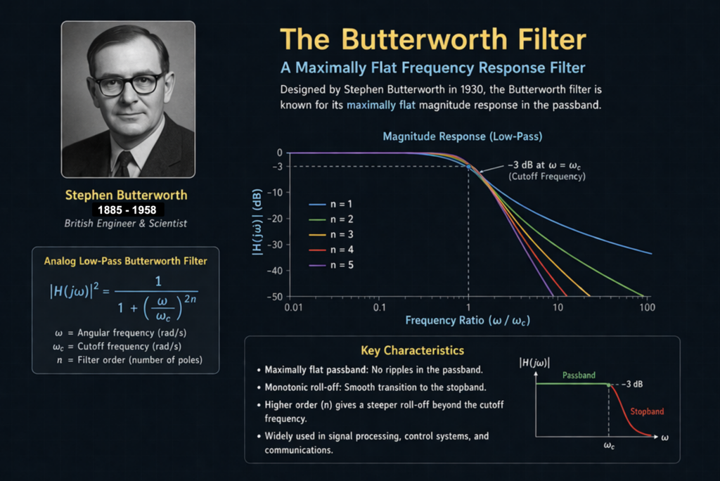 In the 3-pole version, this effect is stronger, producing a smoother curve, which helps traders better identify true market direction while filtering out short-term fluctuations or that bothersome “market noise.” For you technical individuals, we’ve included a graphic explanation of the filter and Mr. Butterworth’s glamour shot. Hot stuff!